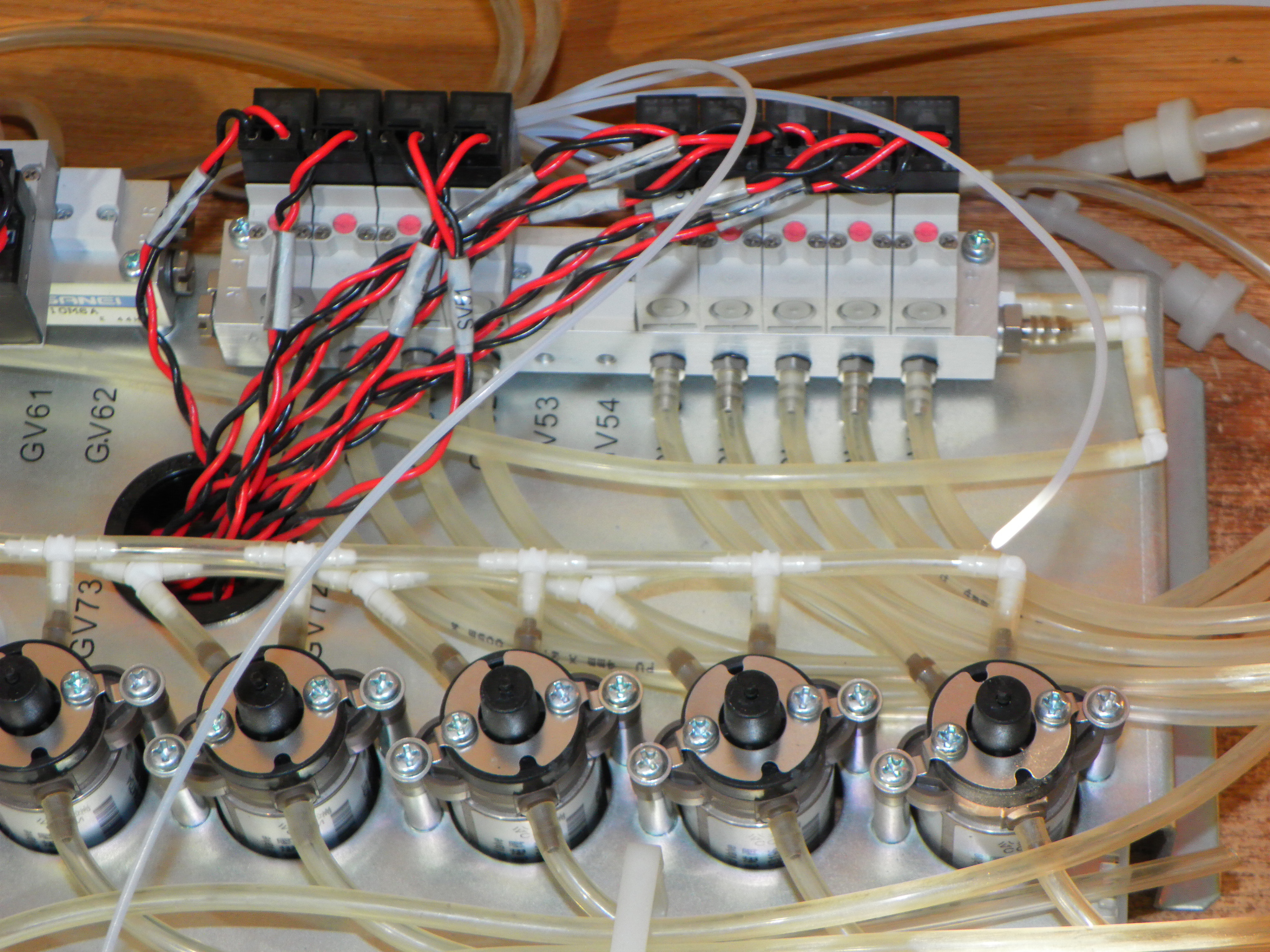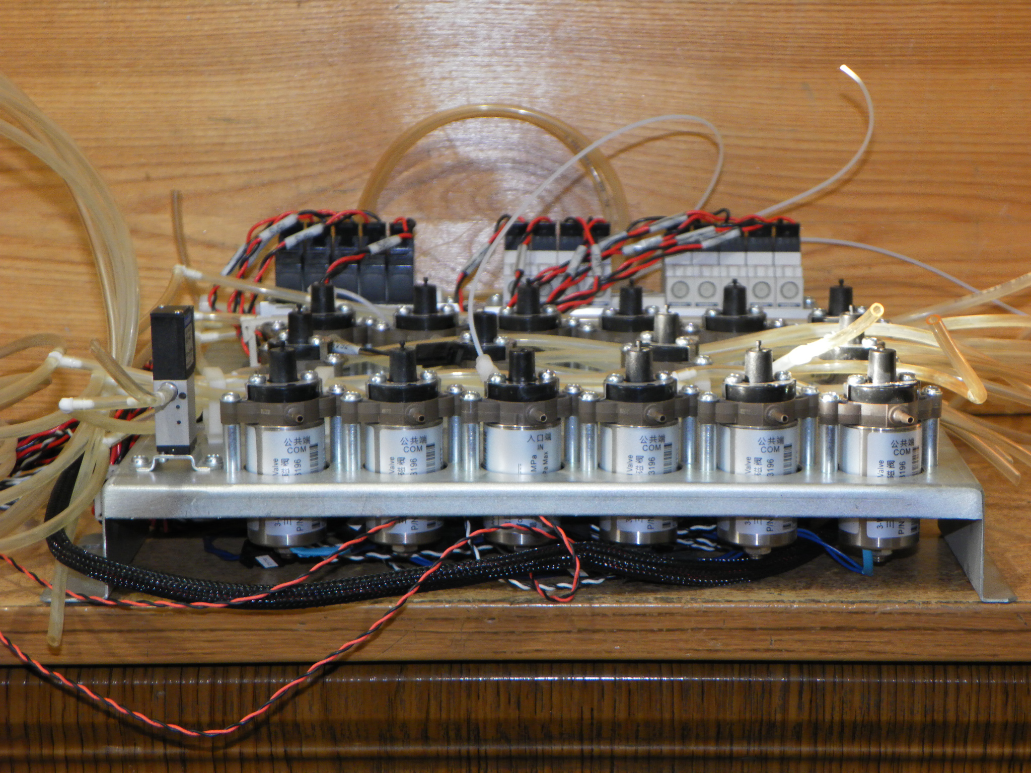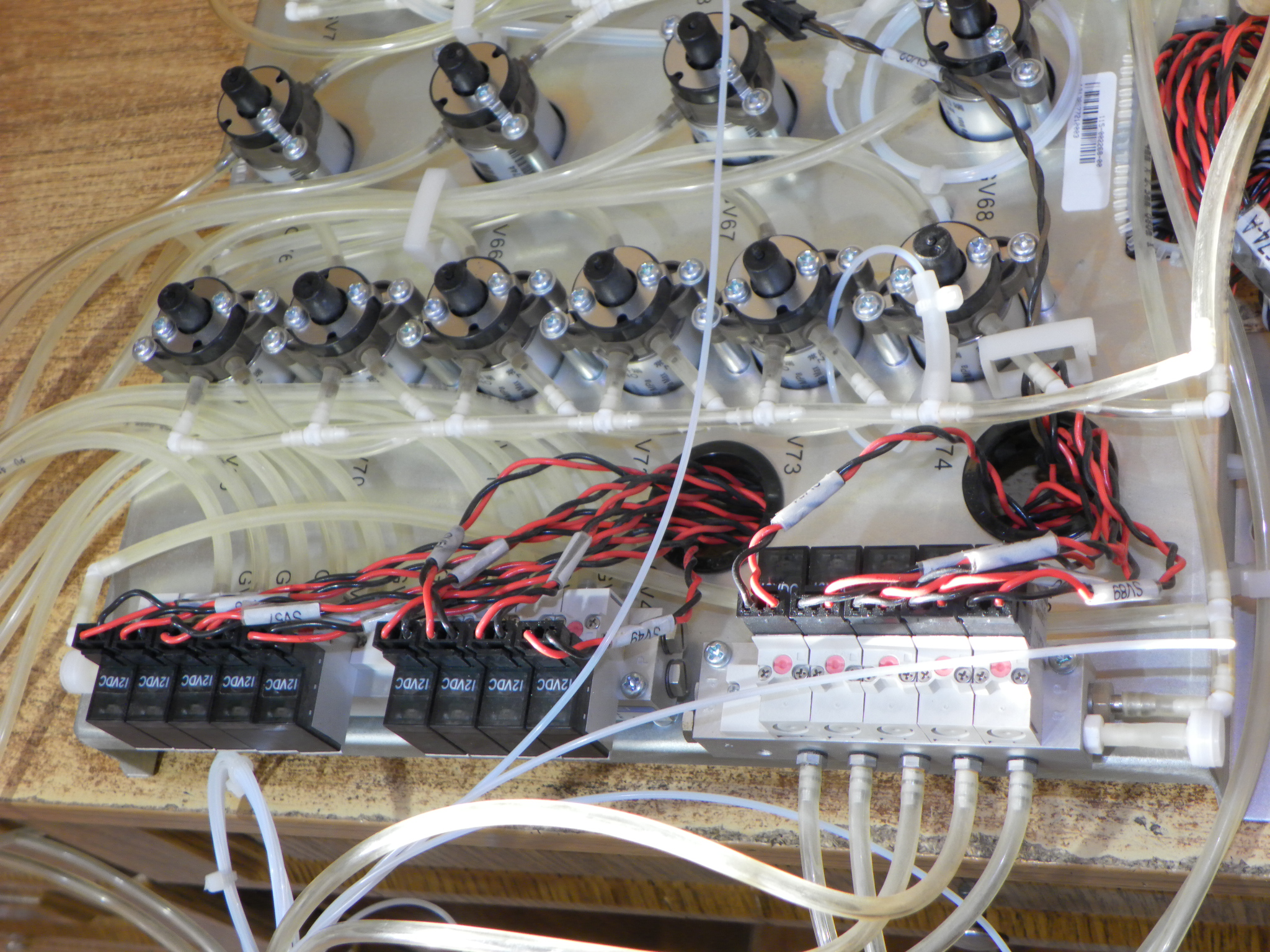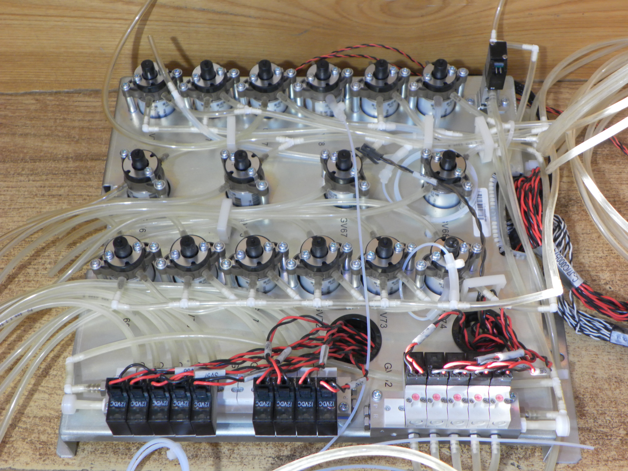 Deska s pneumatickými a hydraulickými ventily a rozvaděči vymontovaná z automatického analyzátoru kapalin.