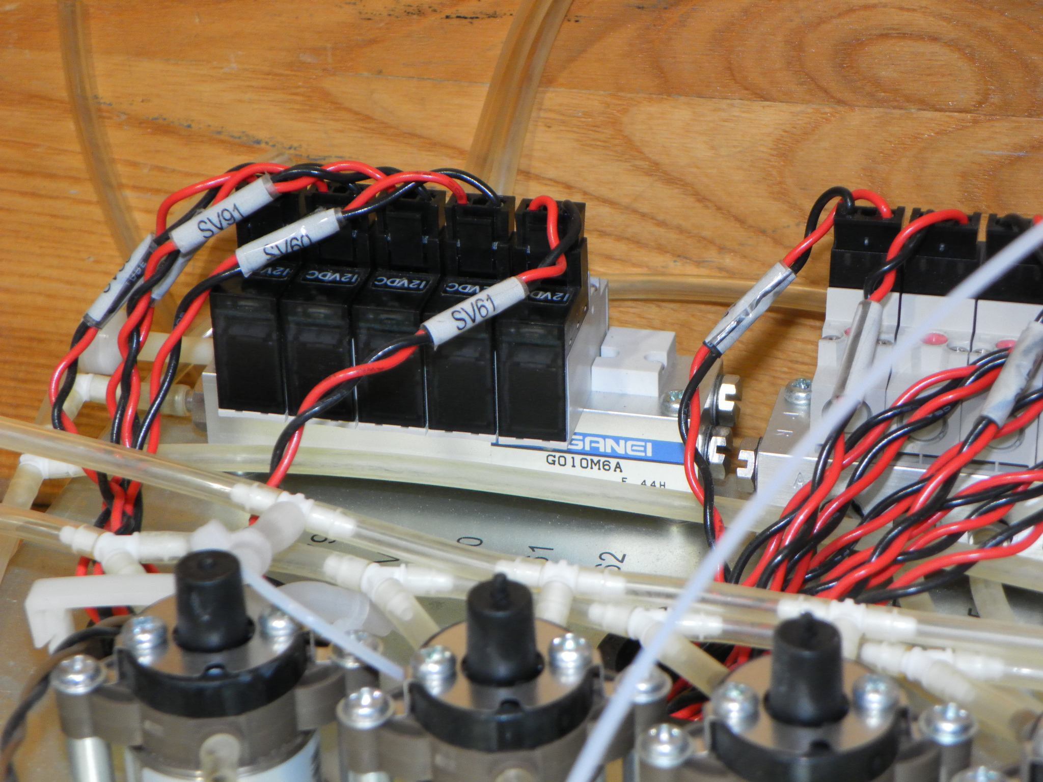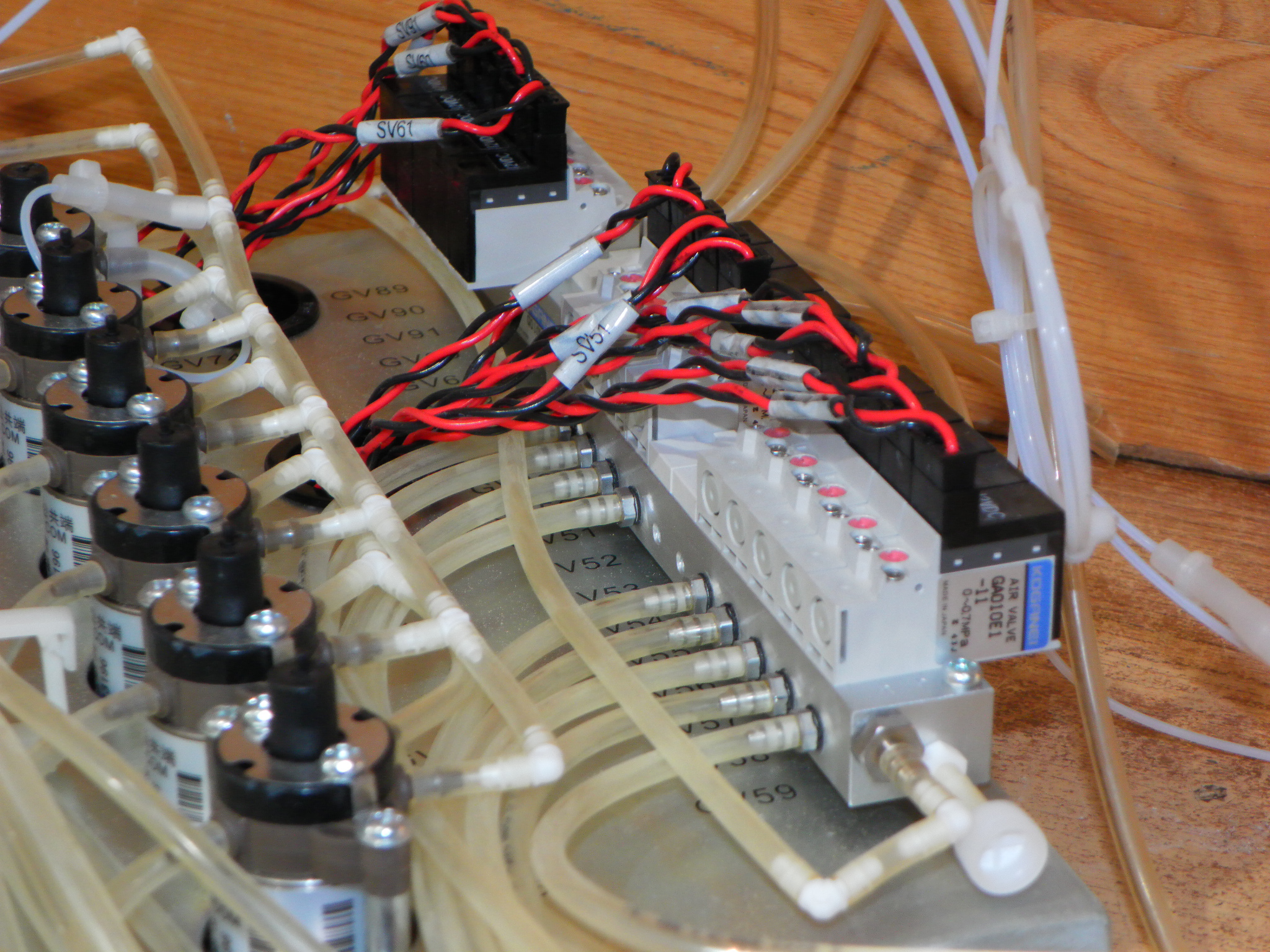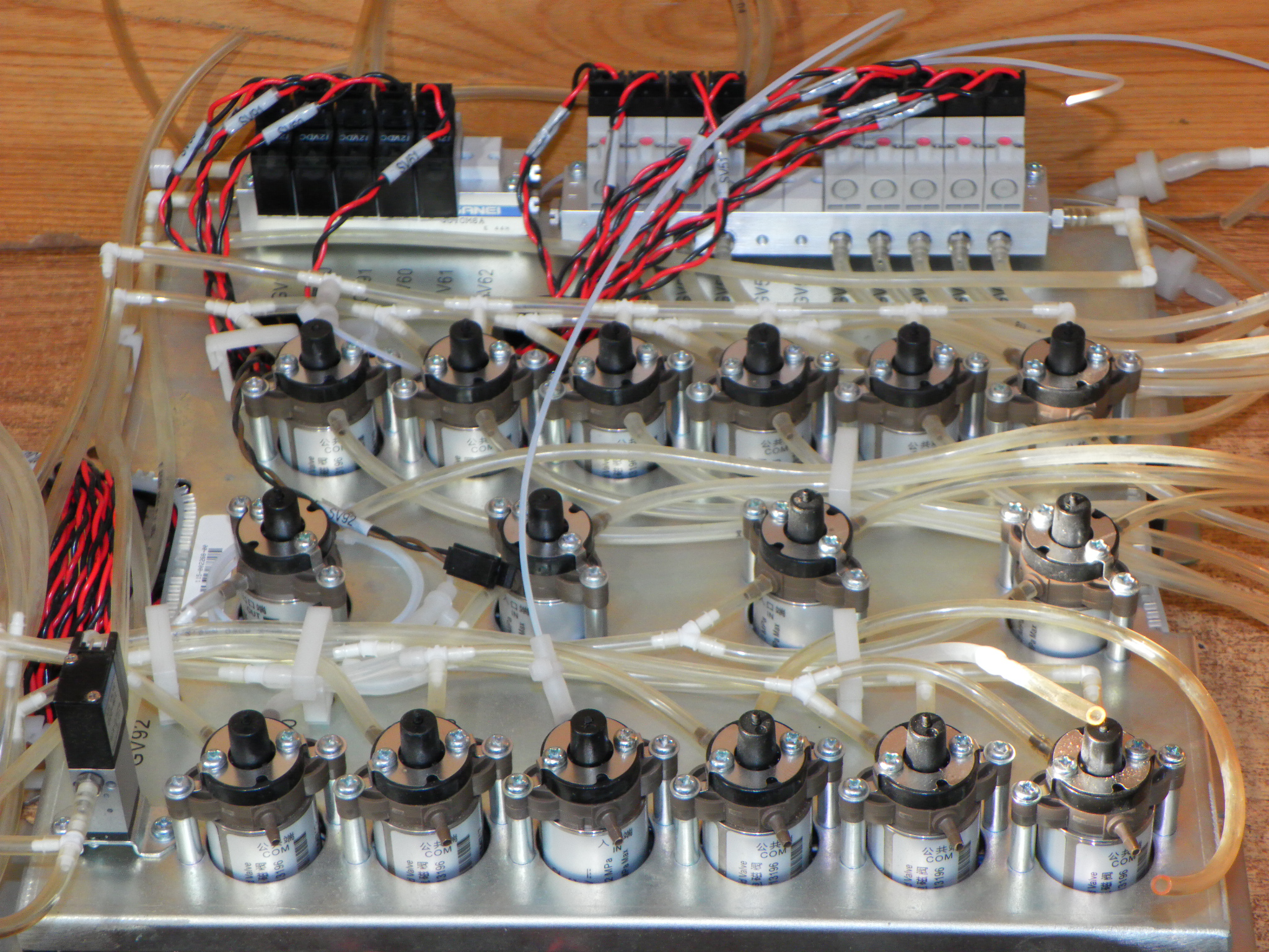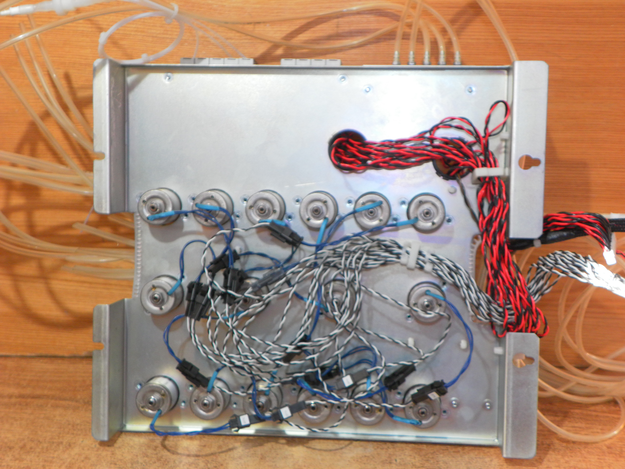 Deska s pneumatickými a hydraulickými ventily a rozvaděči vymontovaná z automatického analyzátoru kapalin.